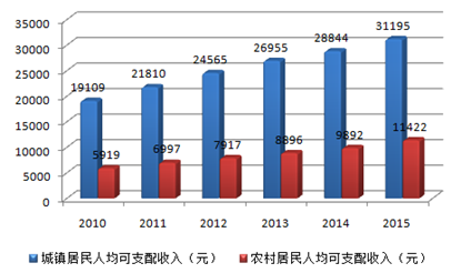 2010-2015年中國居民人均可支配收入