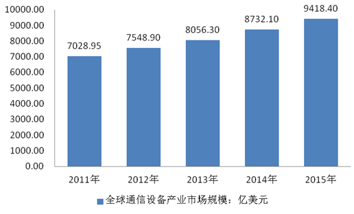 2014年達到8732.10億美元,2015年全球通信設備產業規模超過9400億美元,保持穩定增長,其中移動通信設備市場規模繼續放大。