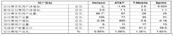 2015年1-9月美國各大無線運營商各大指標運營情況