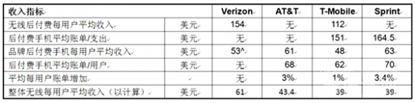 Verizon繼續保持著業內最強勁的定價能力,這主要歸功于其廣泛的覆蓋范圍、出色的服務質量以及強大的品牌知名度。Verizon無線業務的整體每用戶平均收入(在用戶總數方面)在60美元以上,相比之下,Sprint和T-Mobile只有40美元。正如此前的預期,受客戶采用設備分期付款計劃(這對服務收入的貢獻較少)影響,各主要運營商的后付費每用戶平均收入整體呈下降趨勢。這就是說,各運營商的每用戶平均帳單支出(包括服務收入和分期付款計劃支出)呈上升趨勢,表明價格戰的凈影響可能比較有限。