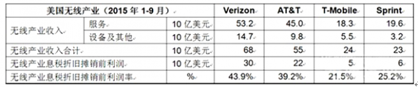 核心提示:2015年的美國無線行業并不平靜,各大運營商在一個日漸飽和的市場中展開了強大的促銷和激烈的競爭活動。將在接下來的部分比較Verizon、AT&T、Sprint和T-Mobile四大運營商2015年前9個月的財務和經營業績,并闡明美國無線行業2015年的美國無線行業并不平靜,各大運營商在一個日漸飽和的市場中展開了強大的促銷和激烈的競爭活動。將在接下來的部分比較Verizon、AT&T、Sprint和T-Mobile四大運營商2015年前9個月的財務和經營業績,并闡明美國無線行業內部一些更為廣泛的發展趨勢。
