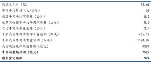 在牛肉消費攀升已成大勢所趨的情況下,未來需求增長空間有多大呢?根據2014年美國農業部公布的全球牛肉消費數據,我國人均牛肉消費5.2公斤,同世界其他國家平均水平8.6公斤相比還有3.4公斤差距,按照目前牛肉均價63元/公斤以及總人口13.67億來估算,當達到世界平均水平時,我國牛肉消費量將突破1100萬噸,肉消費額將達到7000多億元,相比現在有近40%的增長,需求上升潛力巨大。