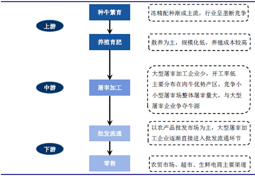 核心提示:我國養牛業歷史悠久,但長期以來牛主要以役用為主。改革開放以來,隨著現代化農業技術的普及以及居民牛肉需求的不斷上升,我國商品肉牛業開始起步并逐漸形成了上游種牛繁育和養殖育肥、中游屠宰加工、下游產品批發流通和零售的完整產業鏈模式。肉牛產業鏈資料我國養牛業歷史悠久,但長期以來牛主要以役用為主。改革開放以來,隨著現代化農業技術的普及以及居民牛肉需求的不斷上升,我國商品肉牛業開始起步并逐漸形成了上游種牛繁育和養殖育肥、中游屠宰加工、下游產品批發流通和零售的完整產業鏈模式。