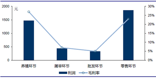 在肉牛產業鏈的各環節利潤率方面,呈現兩頭利潤率高、中間低的現象。根據艾格農業對2014年我國肉牛產業鏈各環節的盈利狀況報告,屠宰和批發環節利潤較低,平均為631元/頭和300元/頭;養殖與零售利潤較高,平均有1486元/頭和1700元/頭,“U型”牛產業鏈曲線特征明顯。