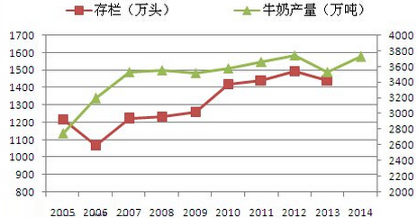 2005-2014年我國奶牛存欄和牛奶產量情況