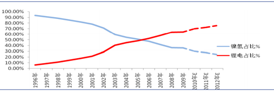 電池類型電壓/V重量比能量/Wh/kg體積比能量/Wh/L比功率w/kg循環壽命/次每月自放電率有害物質鉛酸電池230-4560-90150—400300-5004-5%鉛鎳氫電池1.260-80150-200160—230500-100030-35%/鋰離子電池3.7110-190250-500400-13001000-2000<5%/1996-2012 年鎳氫、鋰電市場占比情況