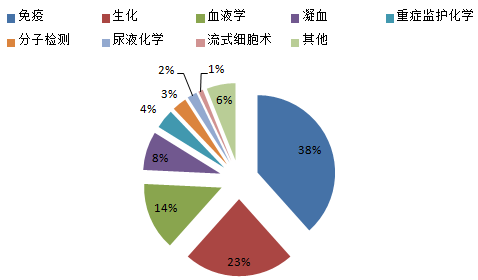 根據《中國醫藥健康藍皮書》中發布的數據,2014年市場份額最大的是免疫診斷,占比38%,生化診斷和分子診斷占比分別為19%和15%,其他占比28%。