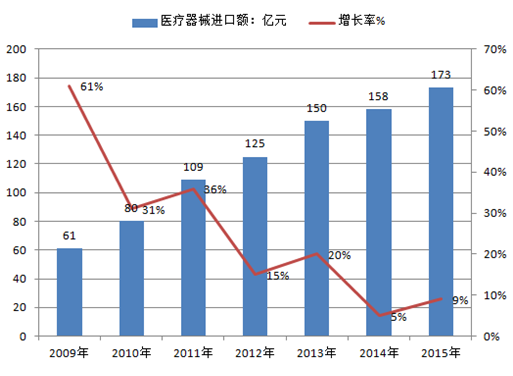 由于國(guó)內(nèi)醫(yī)療器械企業(yè)普遍在技術(shù)上不夠成熟,目前高端產(chǎn)品主要依賴進(jìn)口。2015 年,中國(guó)醫(yī)療器械進(jìn)口額173 億美元,同比增長(zhǎng)9.8%。進(jìn)口醫(yī)療器械普遍價(jià)格昂貴,如TOMO 放射治療系統(tǒng)等設(shè)備價(jià)格高達(dá)500 萬(wàn)美元以上。