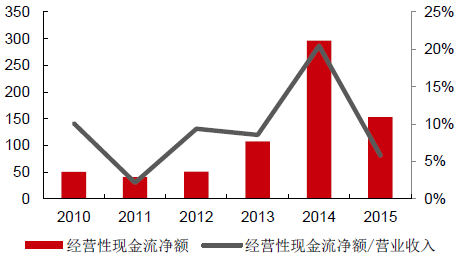 2015年行業經營性現金流下滑顯著,主要是生產規模擴大支付購買材料款、職工薪酬等增加所致。同時,由于下半年動車組交付推遲,造成零部件公司存貨周轉速度減慢。