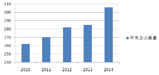 2010 年至2014 年間,我國寵物食品行業規模以上企業數量及其變化情況如下所示: