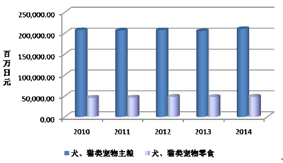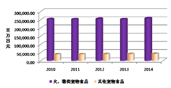 如上圖所示,日本寵物食品市場增長比較緩慢,2010 年至2014 年間,增長率約為0.64%。至2014 年末,日本寵物食品市場規模約為2,975.65 億日元,其中犬、貓類寵物食品的市場規模約為2,569.20 億日元,占寵物食品總規模的86.34%。