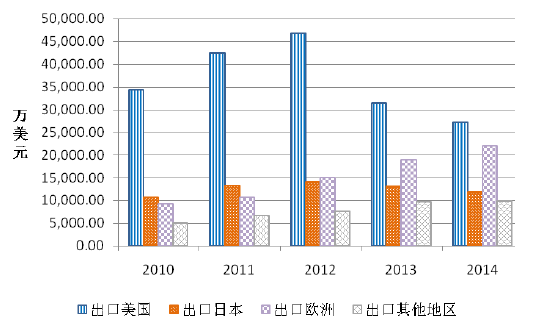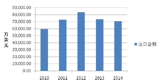 我國寵物食品出口規模在 2010 年至2012 年間增長較快,自2013 年開始出現下降,至2014 年漸趨穩定,該年度實現出口額為70,761.02 萬美元。我國寵物食品出口規模自2013 年開始出現下降主要受美國的寵物食品安全事件和日本寵物食品市場增長乏力的影響所致,我國寵物食品出口規模如下所示: