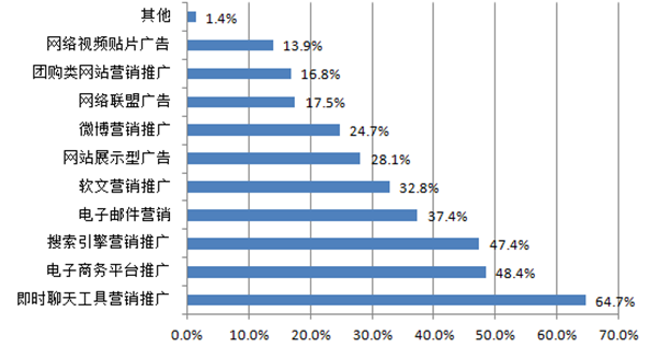 以互聯網營銷為例,據 CNNIC 統計,在開展過互聯網營銷的企業中,35.5%通過移動互聯網進行了營銷推廣,其中有 21.9%的企業使用過付費推廣。在各種移動營銷推廣方式中,微信營銷推廣受企業歡迎,使用率達 75.3% 。目前,微信營銷推廣主要有三種方式:微信朋友圈廣告主要服務于財富 500 強企業,微信公眾賬號推廣與微店運營則更適合中小微企業。
