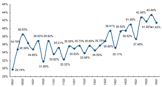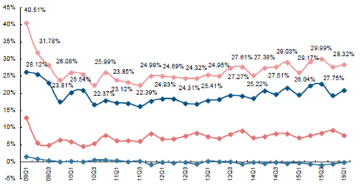 2015 年四季度老板電器毛利率同比下滑0.02 個百分點,華帝股份則同比提升3.79 個百分點;而2016 年一季度老板電器毛利率提升2.07 個百分點,而華帝毛利率則提升3.81 個百分點;我們判斷在產品結構改善及電商收入占比提升等因素驅動下廚電龍頭毛利率仍有一定提升空間。