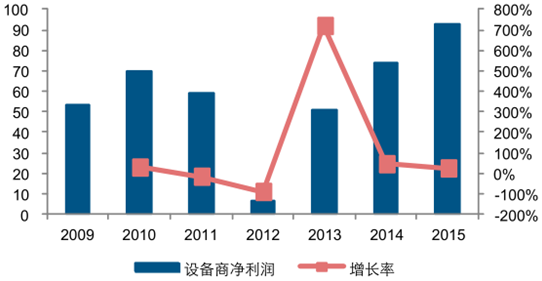 2009-2015 年設備商凈利潤情況(億元,%)