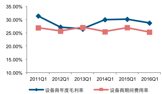 毛利率方面,2015 年設備商整體毛利率水平為 28.76%,同比下降 0.6 個百分點;與此同時,行業整體期間費用率穩定下行,2015 年設備商的期間費用率為 23.32%,同比下降 1.06 個百分點,為設備商盈利能力提升提供保障。