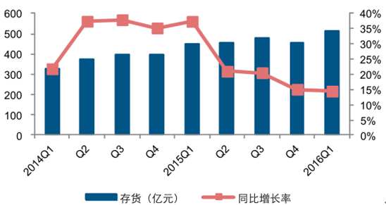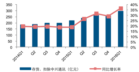 存貨方面, 2016 年第一季度, 主流設備商存貨金額合計 515.79 億元, 同比增長 14.49%,扣除中興后設備商存貨金額為 297.91 億元,同比增長 36.61%。在行業需求持續上升的背景下,設備商加大原材料備貨以及產品生產規模,側面應征了通信行業景氣向上的發展態勢。