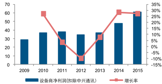 2009-2015年扣除中興后設備商凈利潤情況(億元,%)