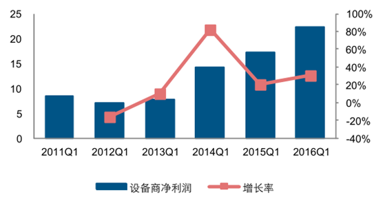 2011-2016 年第一季度設備商凈利潤情況(億元,%)