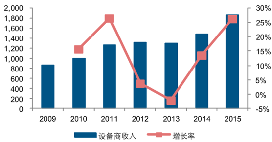 2009-2015 年設備商整體收入情況(億元,%)