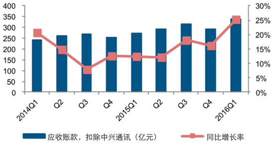 2016 年第一季度主流設備商應收賬款金額為 611.19 億元,同比增長 13.84%,扣除中興后設備商應收賬款金額為 340.62 億元,同比增長 25.28%。可以看到,隨著設備商收入規模的快速擴大,應收賬款的規模也有明顯增大;但其規模仍處于正常水平,賒銷風險依然可控。