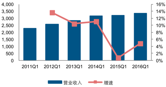 2011-2016年第一季度三大運營商營業收入情況(單位:億元,%)