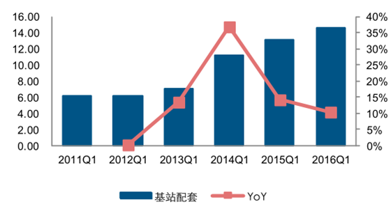 2011-2016 年第一季度基站配套設備營業收入(億元,%)