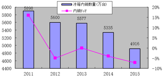 2015 年冰箱總產(chǎn)量為 7317.4 萬(wàn)臺(tái),同比下降 3%;總銷(xiāo)量為 7319.5 萬(wàn)臺(tái),同比下滑 3.7%。 冰箱出口 2404 萬(wàn)臺(tái),同比增長(zhǎng) 4.6%;冰箱內(nèi)銷(xiāo) 4916 萬(wàn)臺(tái),同比下滑 7.2%。