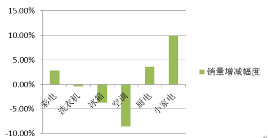 2015年中國(guó)家電各產(chǎn)品銷(xiāo)售量增減幅度對(duì)比圖