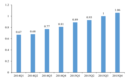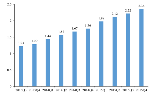 從 2013 年 Q4 到 2015 年Q4,新浪微博月活躍人數(shù)從 1.29 億人增長至 2.36 億人,同比增速在 30%以上。而日活躍人數(shù)由 2014Q4 的 0.81 億人增長至 2015Q4的 1.06 億人,增長率達 30.86%。由此可見,微博現(xiàn)已積累龐大的活躍用戶群體,成為其商業(yè)價值開發(fā)的基礎(chǔ)力量。