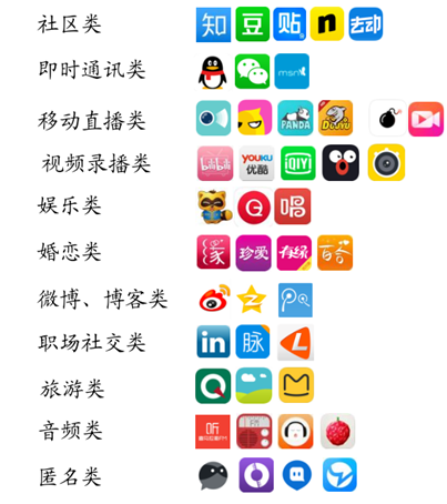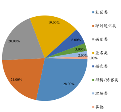 社交需求廣泛存在于生活中的各個方面,因此各類型的社交平臺針對不同需求的用戶群體相繼開發(fā)。社交平臺根據(jù)服務(wù)的場景主要可分為社區(qū)類、 即時通訊類、 娛樂類、匿名類、婚戀類、微博/博客類以及職場類,全面涉及日常生活中的各個領(lǐng)域,其中社區(qū)類和即時通訊類的社交應(yīng)用數(shù)量最多。