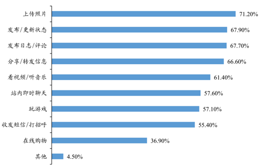 社交媒體最初的目的是架起人與人之間溝通的橋梁,使人們更方便的溝通交流。但隨著社交網(wǎng)絡(luò)的不斷完善,用戶的不同需求相繼得到滿足,越來越多的社交平臺用戶使用場景更加豐富,看視頻、聽音樂、玩游戲、購物等逐漸成為社交平臺吸引受眾的新功能。