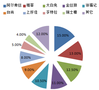 在目前的市場上,大白兔、阿爾卑斯和雅客占據著傳統糖果市場的前三位,金絲猴、徐福記、喔喔等品牌也是傳統糖果市場上的重要品牌,在傳統糖果市場上占據著較大份額。