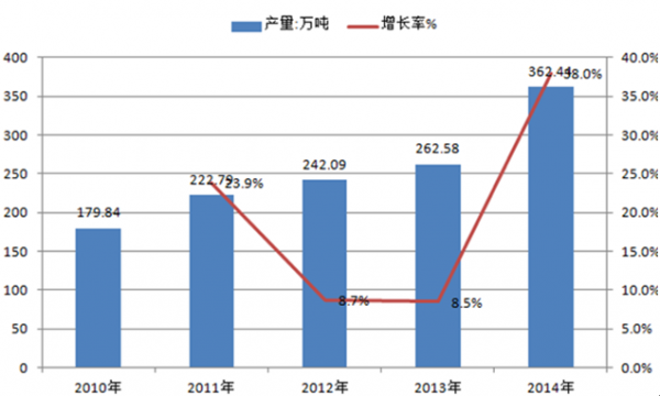 2012年和2013年增長率有所下跌, 2014年中國糖果產量達362萬噸,比去年同期增長38%,預計2015年中國糖果產量會繼續上漲。