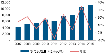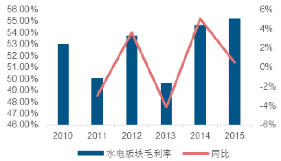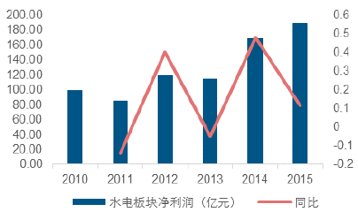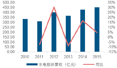 核心提示:“十二五”期間,我國西南水電基地溪洛渡、向家壩、錦屏等一批大中型水電工程投產,帶動全國水電裝機凈增1億千瓦,其中四川云南分別凈增3870和3338萬千瓦。其中,部分大型水電站如錦屏、官地、龍灘水電站由上市公司運營,并“十二五”期間,我國西南水電基地溪洛渡、向家壩、錦屏等一批大中型水電工程投產,帶動全國水電裝機凈增1億千瓦,其中四川云南分別凈增3870和3338萬千瓦。其中,部分大型水電站如錦屏、官地、龍灘水電站由上市公司運營,并于2015年進入全面出力狀態,水電板塊總裝機量得到提升,利好全年營收和業績。此外,由于厄爾尼諾現象持續時間較長,以往“偶豐奇枯”的現象在2015年被打破,全年來水量整體較好,外加國家政策支持水電多發滿發,2015年水電板塊營收同比增長。然而受到全社會用電量增速放緩以及部分水電棄水較為嚴重的影響,營收增速趨緩。2015年,水電板塊實現營業收入449.71億元,同比增長4.77%。