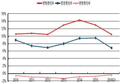 2010-2016年中國白酒行業三大費用率(整體法)