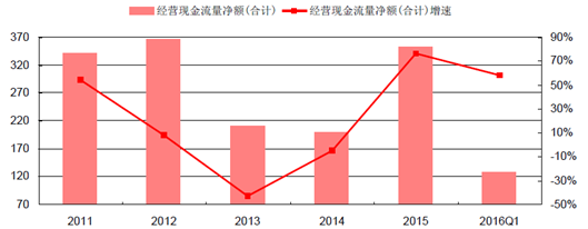 2011-2016年白酒行業經營現金流凈額及增速(單位:億元)