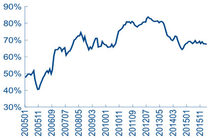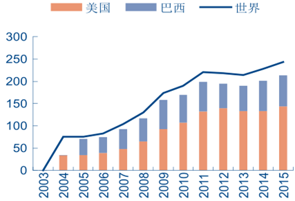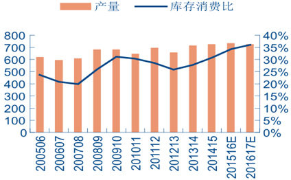 數據顯示,2016 年截止目前全球玉米平均庫存超過 2.07 億噸,而 2015 年全球玉米質燃料乙醇共生產約 4418 萬噸,折算后約對應 1.19 億噸玉米(轉化率為 2.7:1) ,即目前全球玉米庫存量的 60%之多。全球玉米庫存(單位:百萬噸)