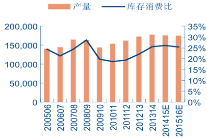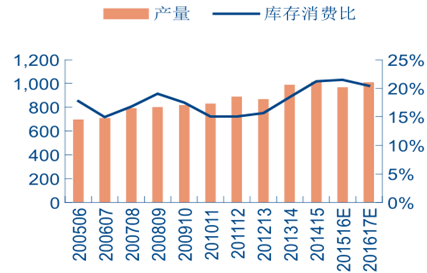 全球蔗糖產量及庫存消費比(單位:千噸)