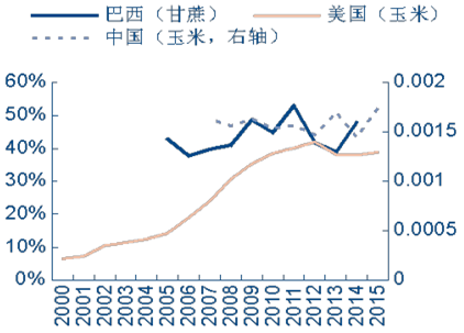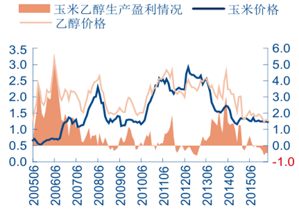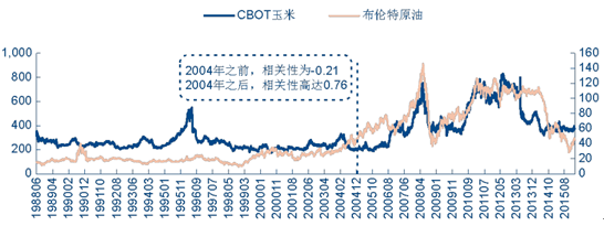 據測算,在1994-2004 年期間, CBOT 玉米價格與布倫特原油價格相關性為-0.21,而在 2004-2015 年期間,其相關性已高達 0.76。玉米價格的波動已不再是基礎的糧食屬性,而是同時兼具了工業原料屬性,其波動的方向與燃料乙醇價格波動緊密相關,甚至互相作用。