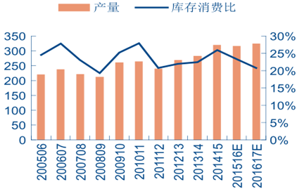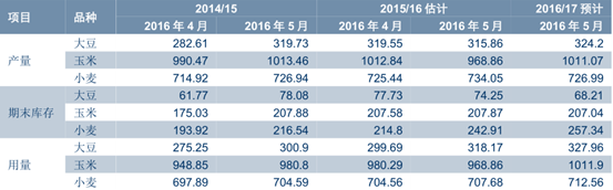 從供需面上看, 由于全球經濟下行、國際需求疲弱等綜合因素,預計糧食作物在 2016/17年度將保持供過于求的狀態。美國農業部(USDA)在最新公布的 5 月全球農產品供需報告中,首次公布了 2016/17 年度供需數據, 雖然上調了 2016/17 年度玉米、 小麥、 大豆的產量,但下調了玉米和大豆的期末庫存量;而小麥期末庫存量,仍然預計有所增長。