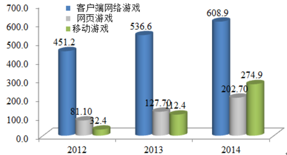 與網頁游戲相比, 客戶端網絡游戲在游戲內容上更為豐富, 玩法上更具深度,且擁有更好的畫面、音效和操作響應能力,所以客戶端網絡游戲的玩家更具穩定性。游戲工委《2012 年中國游戲產業報告》顯示,從目前的市場規模和中國網絡游戲市場的發展來看,在未來相當長的一段時間內,客戶端網絡游戲仍將保持第一的市場份額。2014 年國內客戶端網絡游戲市場銷售收入 608.9 億元人民幣,比 2013 年增長 13.47%,約占中國網絡游戲市場銷售收入的70.04%。
