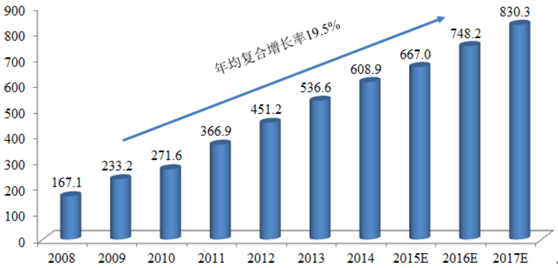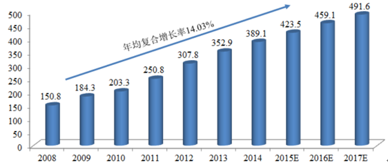 大型角色扮演類客戶端網絡游戲銷售收入增長迅速,銷售收入由 2008 年的150.8 億元增長至 2014 年的 389.1 億元,預計 2017 年大型角色扮演類客戶端網絡游戲市場銷售收入將達到 491.6 億元人民幣。