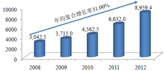 隨著網絡游戲品質的提高和玩家收入水平的上升, 網絡游戲玩家的付費接受度逐漸提高。游戲工委《2012 年中國游戲產業報告》顯示,2012 年中國付費網絡游戲用戶數達到8,959.4 萬人,比 2008 年增加 1.94 倍,2008 年至 2012 年的年均復合增長率為 31.00%。網絡游戲付費玩家數量的提高將帶動網絡游戲行業進入更加快速的增長通道。