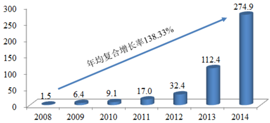 2008-2014 年中國移動游戲市場銷售收入 (單位:億元)