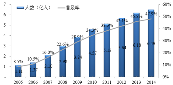 中國互聯網絡信息中心發布的第 35 次《中國互聯網絡發展狀況統計報告》顯示,截至 2014 年 12 月底,中國網民數量達到 6.49 億,互聯網普及率為47.9%,2014年末網民數量較 2013 年末增加 3,117 萬人,普及率提升2.1%。