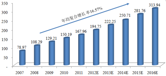 全球網絡游戲市場高速增長,未來增長潛力巨大,隨著互聯網和計算機技術的快速發展,全球網絡游戲市場較快增長。普華永道發布的《2012-2016 年全球娛樂與傳媒行業展望》顯示,全球網絡游戲市場規模已從 2007 年的 78.97 億美元增長至 2011 年的 167.96 億美元,增長了 1.13倍,年均復合增長率為 20.76%,未來幾年全球網絡游戲行業將繼續保持較快發展的態勢,預計 2016 年全球網絡游戲市場規模將達到 313.94 億美元。