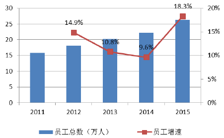 2、軟件行業加大了對研發和人員方面的支出。2015年行業研發支出總計162億元,同比增長27.7%,較上年提升了7.8個百分點,高于行業增速10.5個百分點,促進了管理費用率的提升,但長期來看有利于行業的持續發展。全年來看,行業內上市公司擁有的員工總數為26.2萬人,同比增長18.3%,較上年同期上漲8.7個百分點;行業員工工資支出348億元,同比增長了22.3%,較上年同期提升了9.1個百分點,也對費用提升形成了較大壓力。