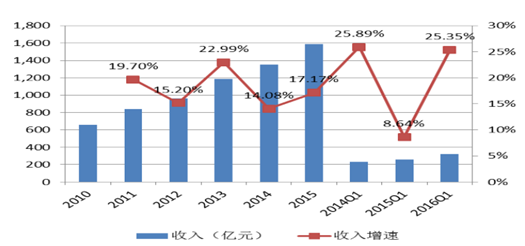 2010 -2016 年 Q1 軟件行業收入及其增速(全部 110 只個股)
