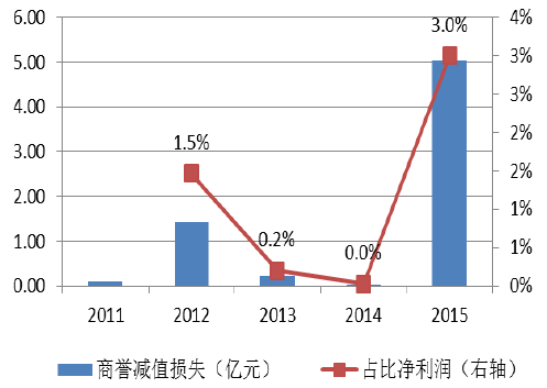 由于并購標的業績不達預期,并購帶來的行業風險已經開始逐步釋放。2015年軟件行業資產減值損失總計26.9億元,同比增長74%,較上年提升了55.4個百分點。其中商譽減值損失由2014年的0.04億元增長到5.04億元,占2015年凈利潤的3%,總計計提家數15家,占比13.6%。